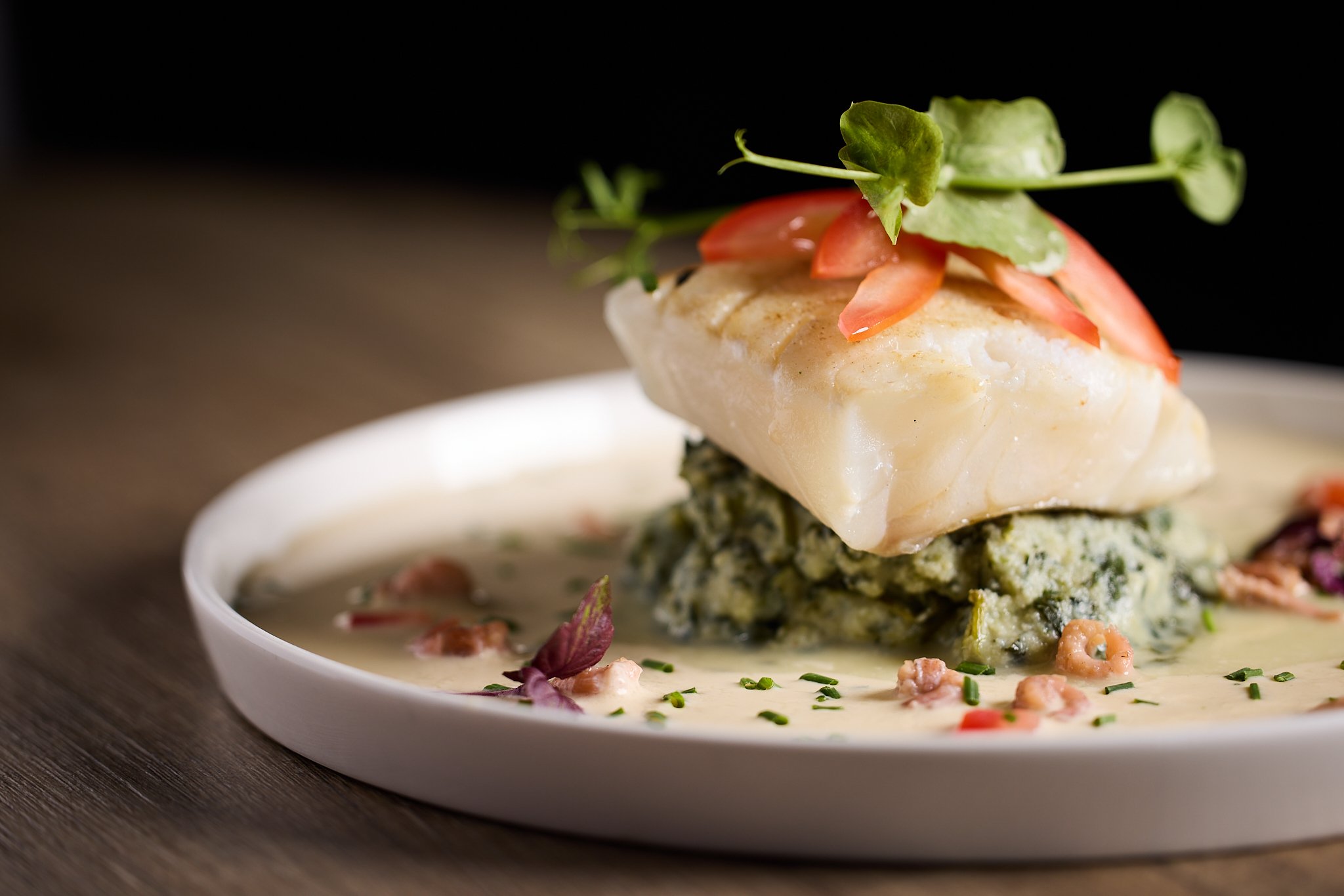 - Kabeljauwhaasje met puree, spinazie en blanke botersaus35,00